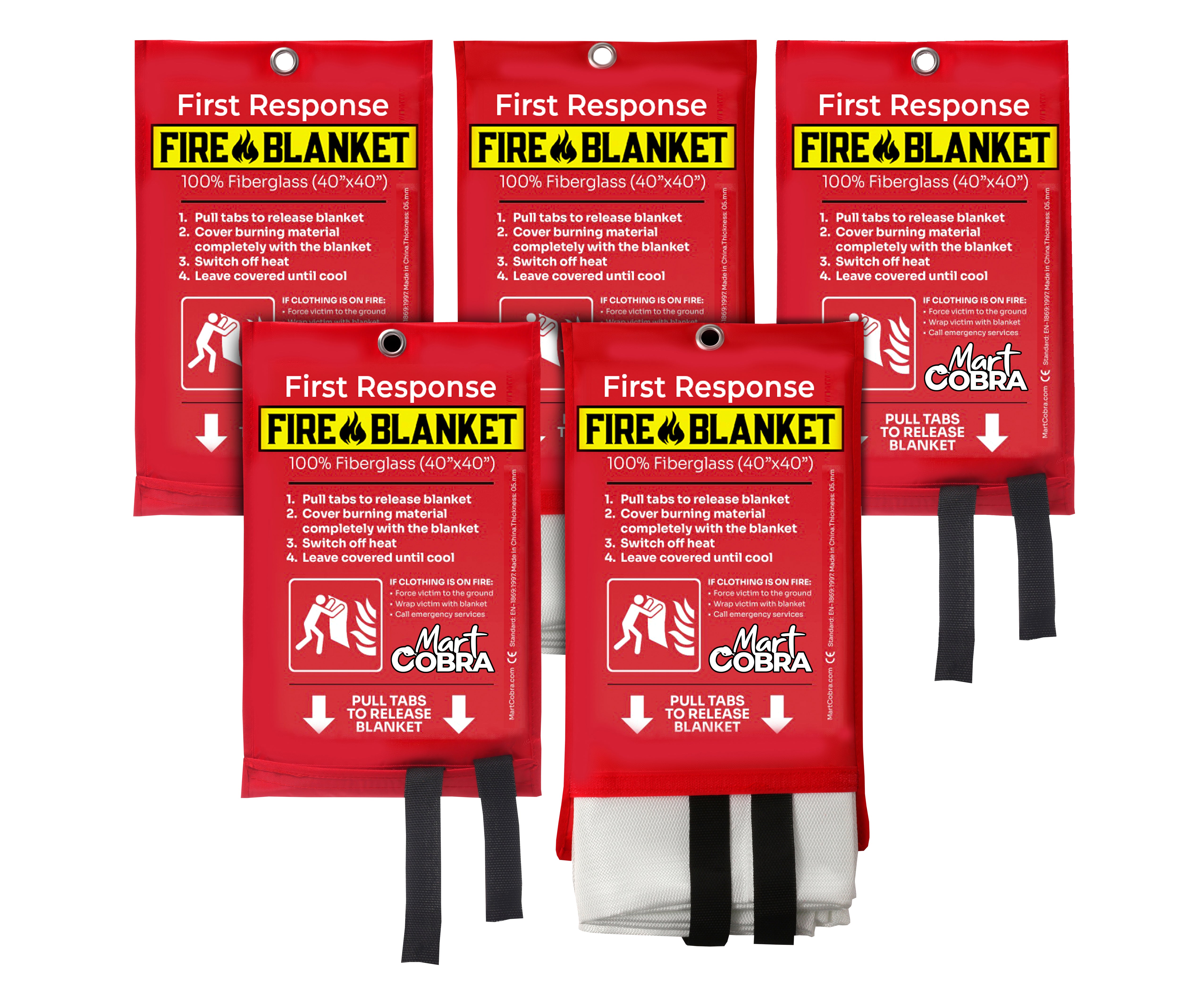 5-pack Emergency Fire Blankets For House Fire Safety: Each fire-resistant blanket cuts off oxygen with no mess, unlike fire extinguishing spray. Fire blanket for people's protection while camping or cooking in a kitchen, home, grill, smoker, boat, or car.